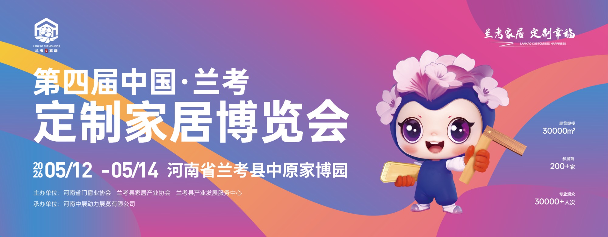 展会简介:第四届中国·兰考定制家居博览会将于2026年5月12日-14日在河南兰考县中原家博园盛大举行。本届博览会以“兰考家居 定制幸福”为主题,在展览规模、参展品牌、展览类别、对接效能等维度全面升级。展览规模达30000平方米,汇聚超200家品牌企业,全面展现定制家居、门类家居、原辅材料、智能机械等创新产品与技术。